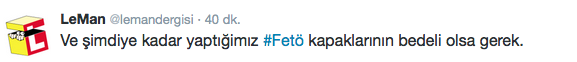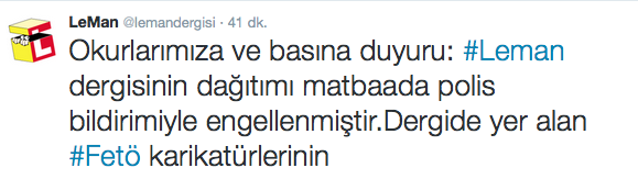 -Okurlarımıza ve basına duyuru: #Leman dergisinin dağıtımı matbaada polis bildirimiyle engellenmiştir.Dergide yer alan #Fetö karikatürlerinin Ve şimdiye kadar yaptığimız #Fetö kapaklarının bedeli olsa gerek.