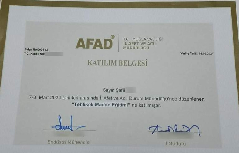 ‘Fecr İslam Gençliği’nin lideri Şafii İ. ise 7-8 Mart 2024’te AFAD’da ‘Tehlikeli Madde Eğitimi’ çerçevesinde endüstriyel ve evsel kimyasal maddelerin hakkında farkındalık eğitimi görmüş.