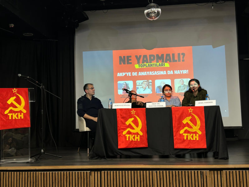 Türkiye Komünist Hareketi tarafından “AKP’ye de anayasasına da hayır” başlığıyla düzenlenen Ne Yapmalı toplantısı, 28 Aralık Pazar günü Sanatif Sahne-Kadıköy Acıbadem’de gerçekleştirildi. Yoğun bir katılımın olduğu toplantıda; TKH Genel Başkanı Aysel Tekerek, TKH MK üyesi Kurtuluş Kılçer, Prof. Dr. İzzettin Önder ve Avukat Doğan Erkan, AKP iktidarının başlattığı yeni anayasa süreciyle ilgili kapsamlı değerlendirmeler yaptı.