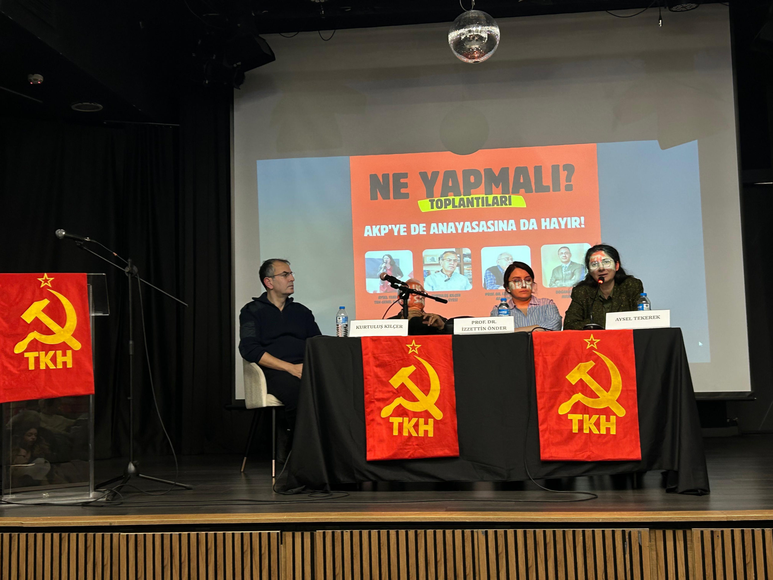 Türkiye Komünist Hareketi’nin “AKP'ye de anayasasına da hayır" sloganıyla İstanbul’da düzenlediği Ne Yapmalı toplantısına katılan konuşmacılar; AKP’nin getirmek istediği yeni anayasanın kendi ömrünü uzatmanın yanı sıra dünya emperyalizmine, yerli ve yabancı sermayenin çıkarlarına hizmet edeceğini belirttiler.