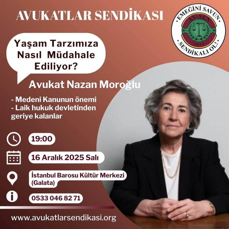 Avukatlar Sendikası'nın bu ayki atölyesinde Av. Nazan Moroğlu, Medeni Hukukun önemini ve Laik Hukuk devletinden geriye kalanları konuşacak.