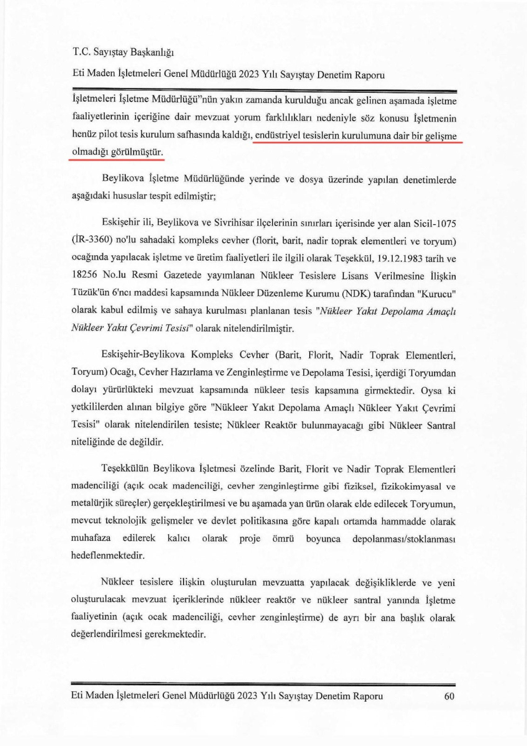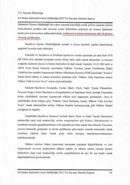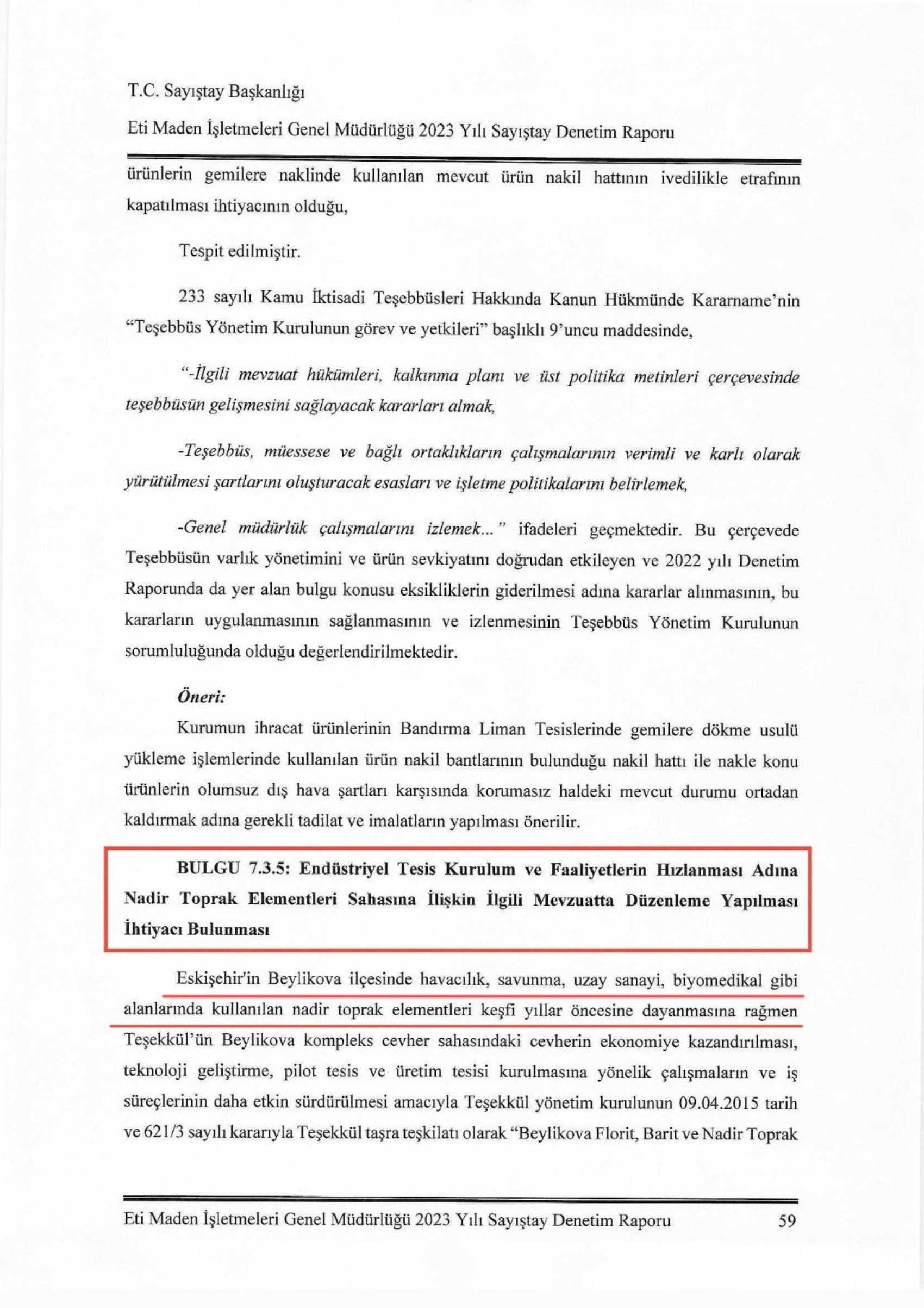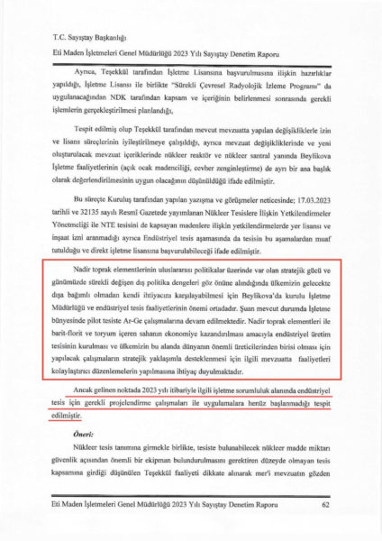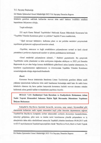 Yavuzyılmaz, “Eti Maden İşletmeleri Sayıştay Denetim Raporuna göre AKP’nin, Eskişehir Beylikova’daki Nadir Toprak Elementlerinin dışa bağımlı olunmadan üretilmesini sağlayacak endüstriyel tesisleri kurma sürecini savsakladığını tespit ettik” ifadelerini kullandı.