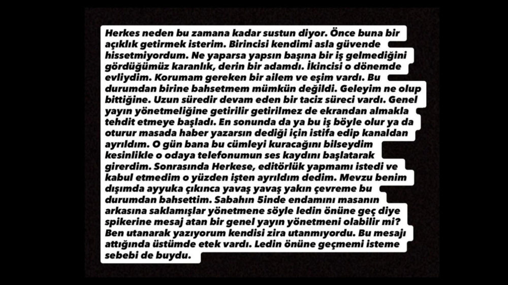 Uzun süredir devam eden bir taciz süreci vardı. Genel yayın yönetmeliğine getirilir getirilmez de ekrandan almakla tehdit etmeye başladı. En sonunda da ya bu iş böyle olur ya da oturur masada haber yazarsın dediği için istifa edip kanaldan ayrıldım. O gün bana bu cümleyi kuracağını bilseydim kesinlikle o odaya telefonumun ses kaydını başlatarak girerdim.