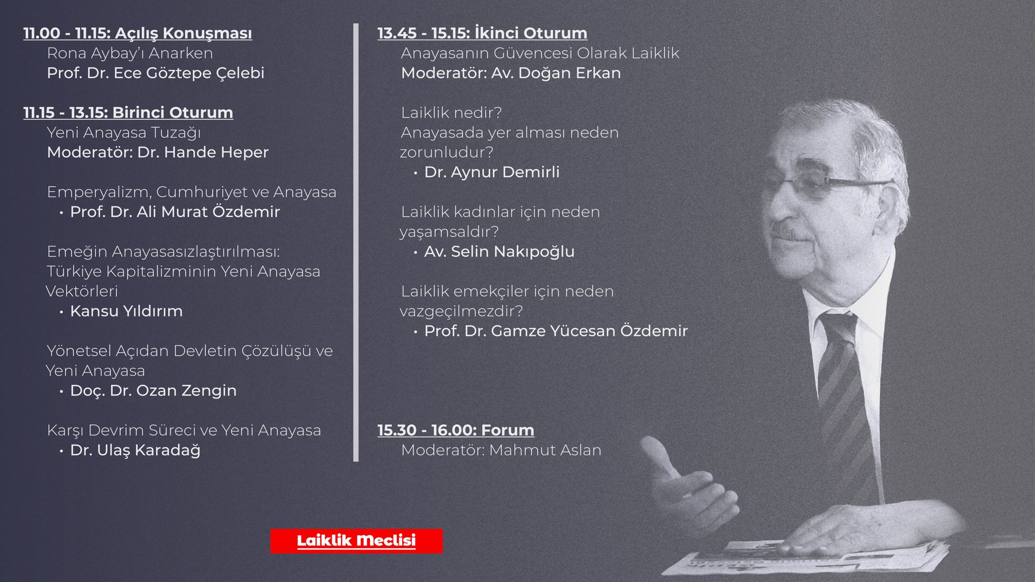 İki oturumdan oluşacak sempozyumun ilk bölümü, Dr. Hande Heper’in moderatörlüğünde “Yeni Anayasa Tuzağı” başlığı altında yapılacak. İkinci oturum ise Av. Doğan Erkan’ın moderatörlüğünde “Anayasa’nın Güvencesi Olarak Laiklik” başlığıyla tartışılmaya açılacak.