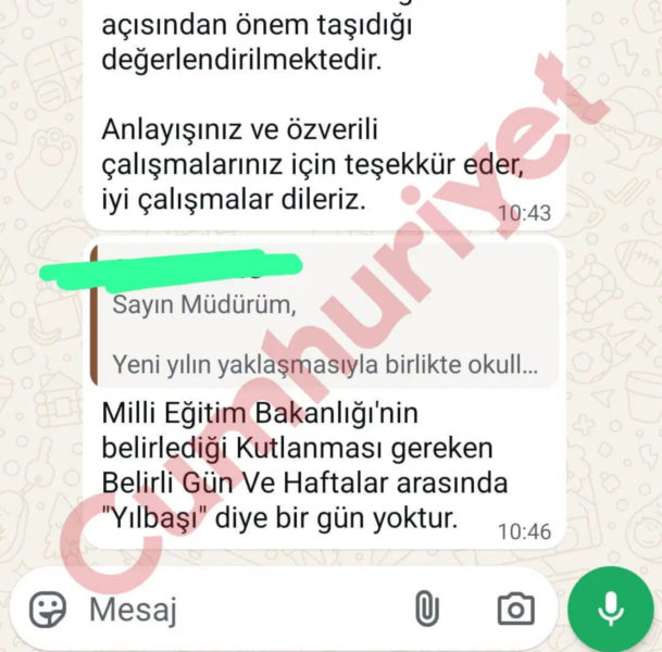 Aynı mesajlaşma grubunda paylaşılan devam açıklamasında ise, “Millî Eğitim Bakanlığı’nın belirlediği kutlanması gereken Belirli Gün ve Haftalar arasında ‘yılbaşı’ diye bir gün yoktur” denildi.