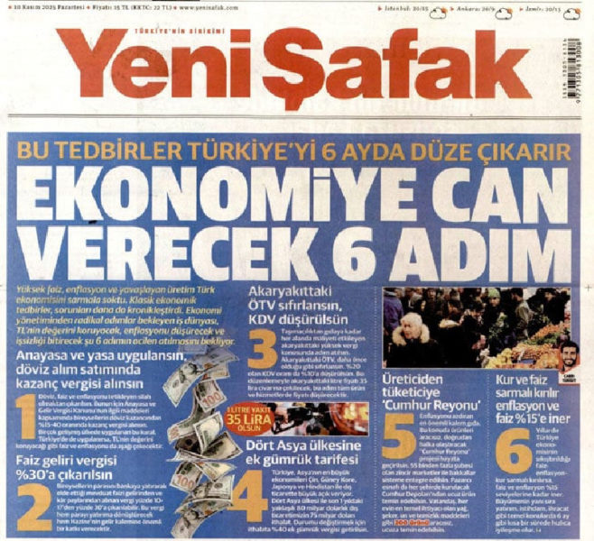 “Ekonomiye can verecek 6 adım: Bu tedbirler Türkiye’yi 6 ayda düze çıkarır” ifadeleri ile kendince çözüm yolları sunan Yeni Şafak, bu adımlar sayesinde benzinin 35 liraya ineceğini savundu.