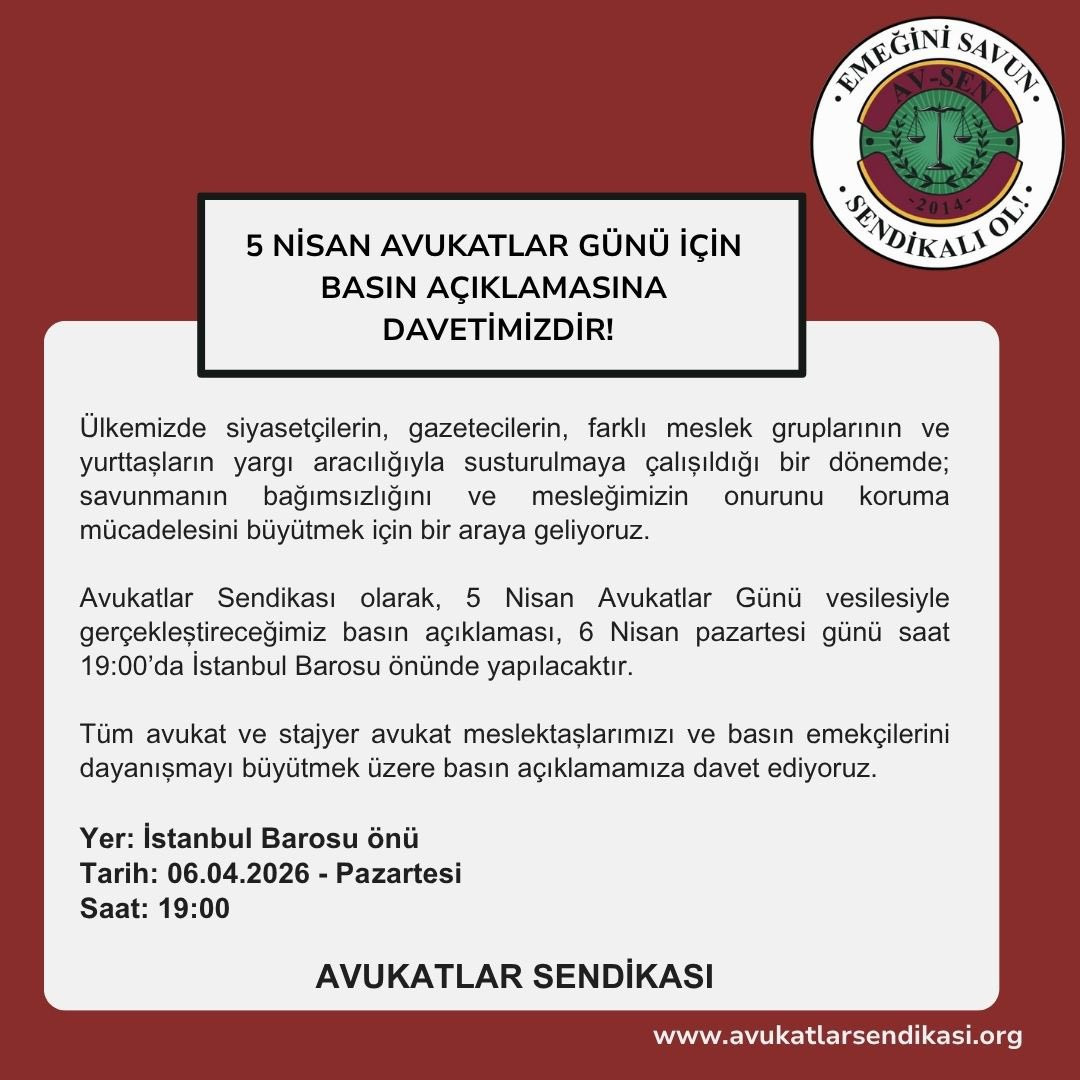 Avukatlar Sendikası, Avukatlar Günü’nde İstanbul Barosu önünde basın açıklaması gerçekleştireceğini açıkladı.