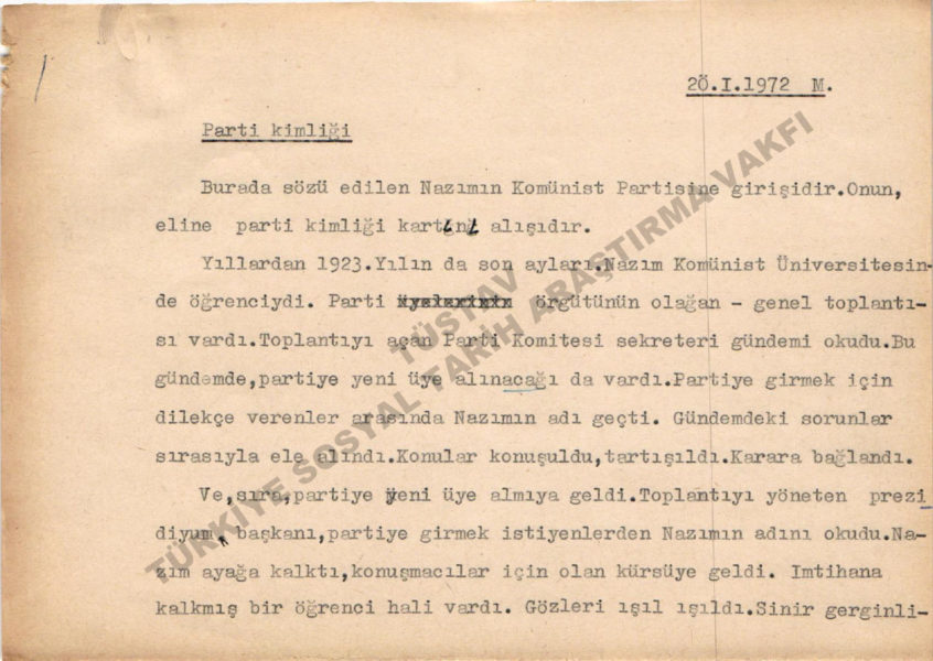 TÜSTAV’ın erişime açtığı TKP’nin Sesi Radyosu Arşivi’nde yer alan bu belge, Nâzım Hikmet’in 1923’te Türkiye Komünist Partisi’ne kabul edilişini ve parti kimliği kartını alışını, dönemin örgütsel işleyişi ve tanıklıklarıyla ortaya koyuyor.