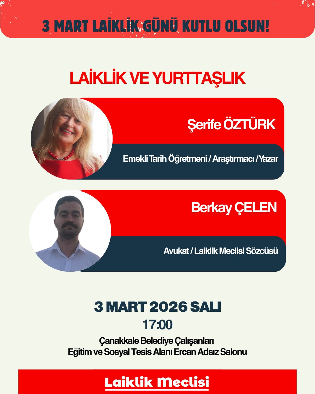 Çanakkale Laiklik Meclisi, 3 Mart Laiklik Günü dolayısı ile Çanakkale’de bir etkinlik düzenleyecek. “Laiklik ve Yurttaşlık” başlığı ile düzenlenecek etkinlikte, Emekli Tarih Öğretmeni / Araştırmacı / Yazar Şerife Öztürk ve Avukat / Laiklik Meclisi Sözcüsü Berkay Çelen konuşma yapacak.