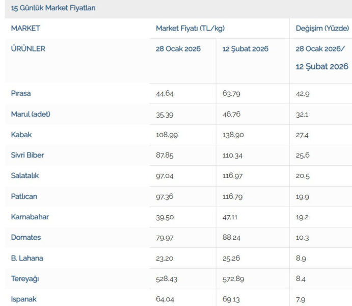 Bayraktar, son bir yıllık sürede marketteki 39 ürünün 32’sinde fiyat artışı yaşandığını vurgularken 28 Ocak-12 Şubat tarihleri arasındaki 15 günlük kısa süreli değişimleri de paylaştı. Buna göre, Ramazan öncesindeki dönemde marketlerdeki 41 ürünün 27’sinde fiyat artışı yaşandığını kaydederek şunları söyledi: “15 günlük süreçte markette fiyatı en fazla artan ürün yüzde 42,9 ile pırasa oldu. Pırasayı yüzde 32,1 ile marul, yüzde 27,4 ile kabak, yüzde 25,6 ile sivri biber izledi. Üretici tarafında ise 33 ürünün 21’inde fiyat artışı yaşandı. Üreticide en fazla fiyat artışı yüzde 47,3 ile maydanozda görülürken, bunu yüzde 36,1 ile marul, yüzde 28,8 ile mandalina izledi. Üreticide en çok fiyat düşüşü ise yüzde 17 ile karnabaharda gerçekleşti.”
