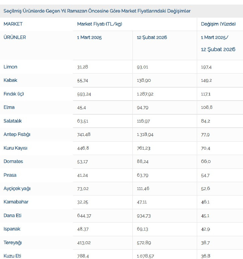 TZOB’un açıkladığı sonuçlara göre markette en fazla fiyat artışı yüzde 197,4 ile limonda görüldü. Limondaki fiyat artışını yüzde 149,2 ile kabak, yüzde 117,1 ile fındık, yüzde 108,8 ile elma izledi. Markette fiyatı en çok düşen ürünler ise yüzde 41,9 ile kuru soğan, yüzde 31,9 ile kuru fasulye, yüzde 26,4 ile nohut ve yüzde 18,3 ile beyaz lahana oldu. TZOB Genel Başkanı Şemsi Bayraktar, “Geçtiğimiz yılın Ramazan öncesine göre bu sene tüketicilerimiz marketten limonu 3 kat, kabağı 2,5 kat, fındığı 2,2 kat ve elmayı 2,1 kat fazlaya alarak tüketmek zorunda kalacaklar. Geçen yıl ile bu yılın Ramazan ayı öncesine göre üreticide 31 ürünün 21’inde fiyat artışı, 9’unda fiyat düşüşü görülürken 1 üründe fiyat değişimi yaşanmadı” dedi.