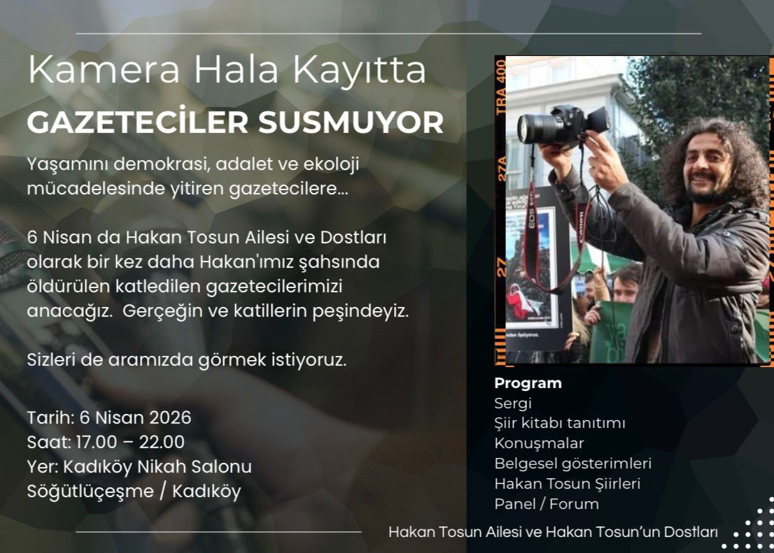 Kadıköy Evlendirme Dairesi’nde Saat 17.00’de başlayacak etkinliğe yapılan çağrıda “6 Nisan’da Kadıköy’de, gazeteciliğin hakikatle kurduğu o onurlu bağın izini süreceğiz. Hakan Tosun’un görüntülerine, dostlarının sözlerine ve mücadele arkadaşlarının tanıklıklarına kulak vereceğiz. Aynı zamanda Türkiye’de ve dünyada demokrasi, adalet ve ekoloji mücadelesinde yaşamını yitiren gazetecileri birlikte anacağız” ifadeleri kullanıldı.