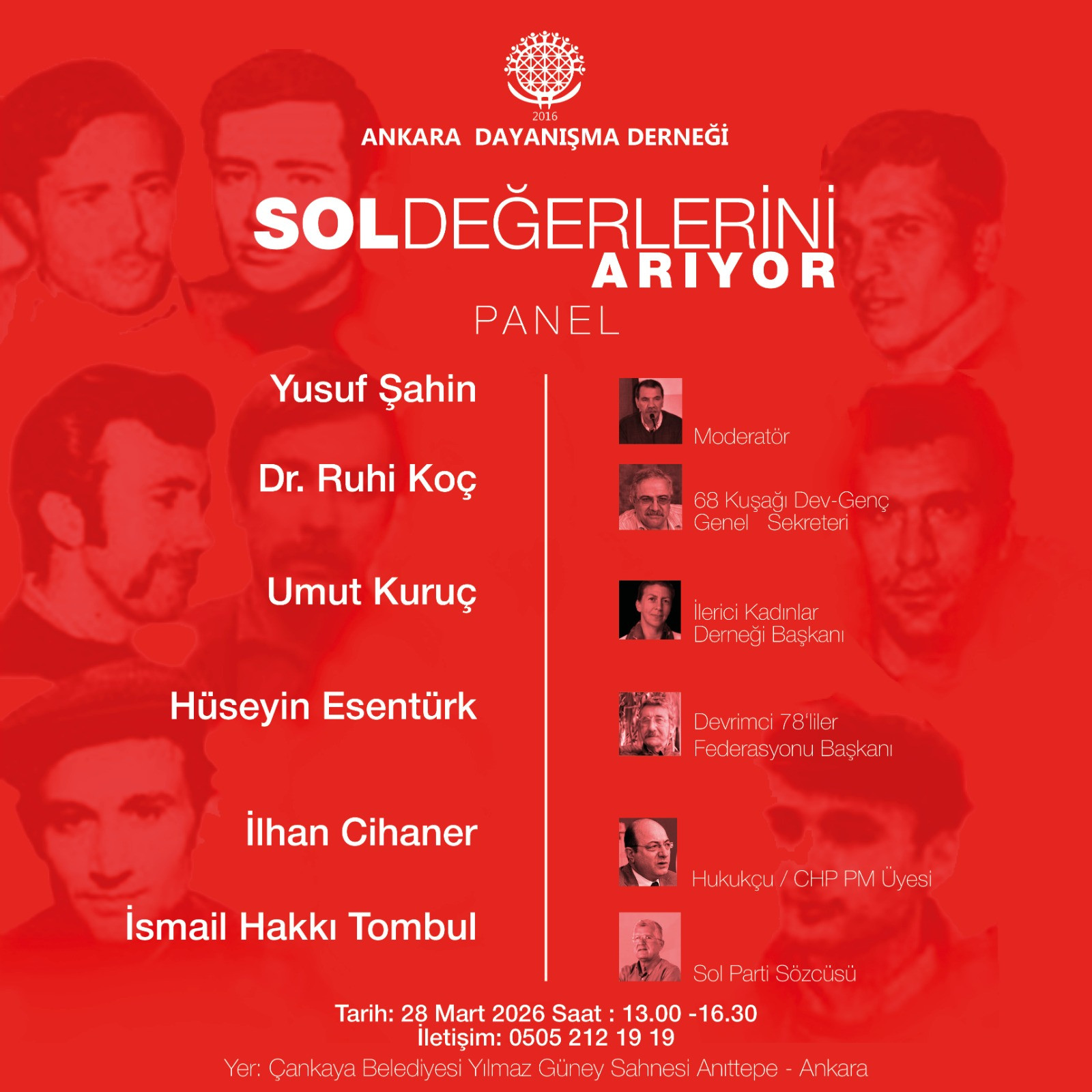 Ankara Dayanışma Derneği’nin düzenlediği “Sol Değerlerini Arıyor” paneli bugün 13:00’de Çankaya Belediyesi Anıttepe Sahnesi’nde gerçekleşecek. Panele ilişkin yapılan çağrıda şu ifadeler yer alıyor;