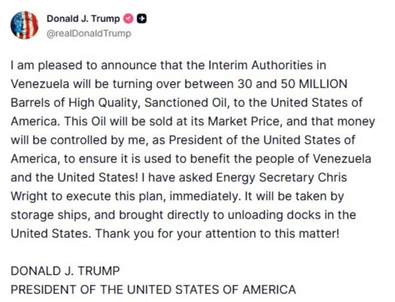 Trump, sahibi olduğu Truth Social platformu üzerinden yaptığı paylaşımda, Venezuela’daki geçici yönetimin yaptırım altında bulunan 30 ila 50 milyon varil arasında yüksek kaliteli petrolü ABD’ye devredeceğini duyurdu. Söz konusu petrolün piyasa fiyatı üzerinden satışa sunulacağını ifade eden Trump, gelirlerin kullanımına ilişkin detaylara da yer verdi.