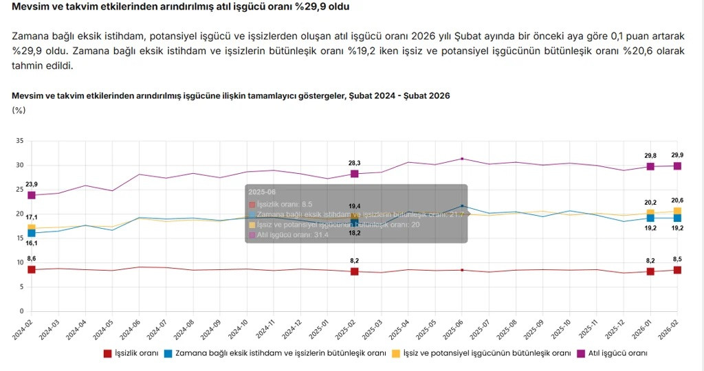 Zamana bağlı eksik istihdam, potansiyel işgücü ve işsizlerden oluşan; geniş tanımlı işsizlik olarak değerlendirilen atıl işgücü oranı da yüksek seyrini sürdürdü. Şubat ayında bu oran yüzde 29,9 olarak açıklandı.
