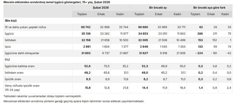 Türkiye İstatistik Kurumu (TÜİK), Şubat 2026 işgücü istatistiklerini açıkladı. Buna göre işsiz sayısı bir önceki aya göre 133 bin kişi artarak 2 milyon 981 bine yükseldi. İşsizlik oranı da 0,3 puanlık artışla yüzde 8,5 seviyesine çıktı.