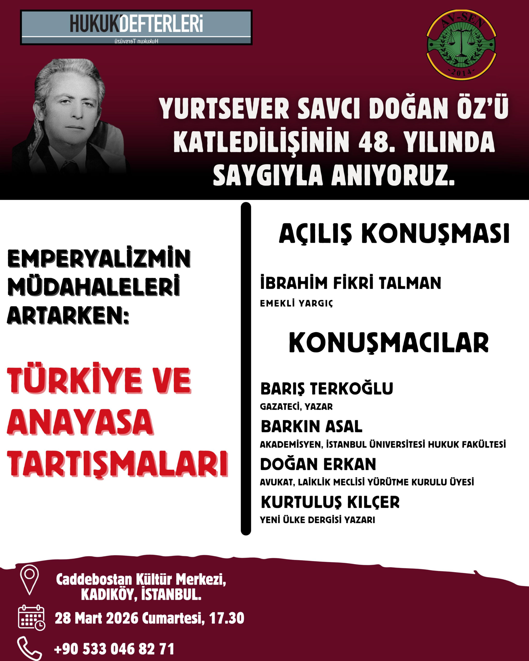 24 Mart 1978’de uğradığı silahlı saldırı sonucu yaşamını yitiren Yurtsever Savcı Doğan Öz, ölümünün 48. yıldönümünde “Emperyalizmin Müdahaleleri Artarken: Türkiye ve Anayasa Tartışmaları” başlıklı panel ile anılacak.